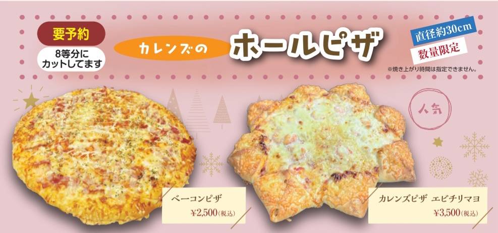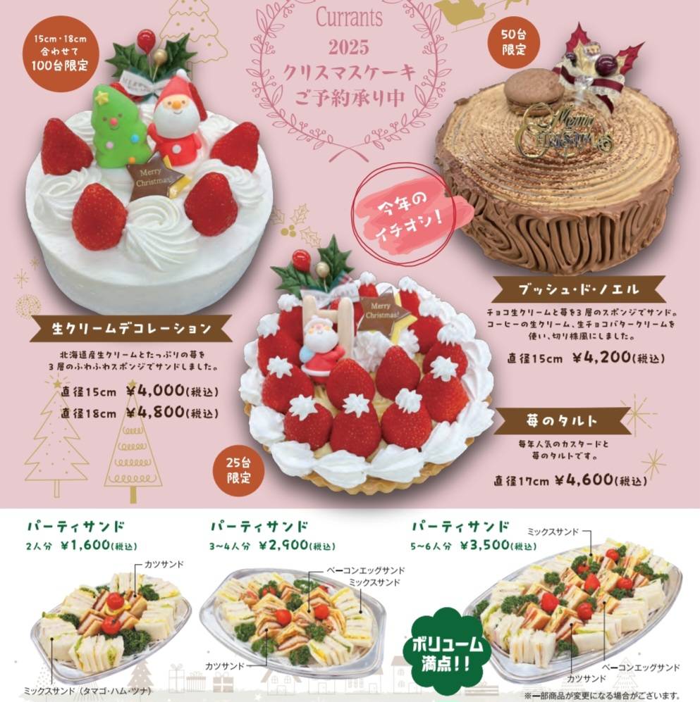 カレンズ『クリスマスケーキ』『パーティーサンド』『ホールピザ』 2025年11月21日 だんだんと寒くなり、冬の気配が近づいてきました。 今年も、カレンズの「クリスマスケーキ」と、「パーティサンド」「ホールピザ」でクリスマスを過ごしませんか? ご予約承っております。 ご予約の方お一人様に一冊『クーポン付きカレンダー』プレゼント♪ お申し込みは12月14日(日)までにお願いいたします。 毎週水曜日現金お支払いで5%オフの対象外となりますので、ご注意ください。